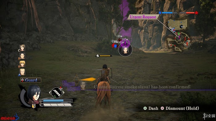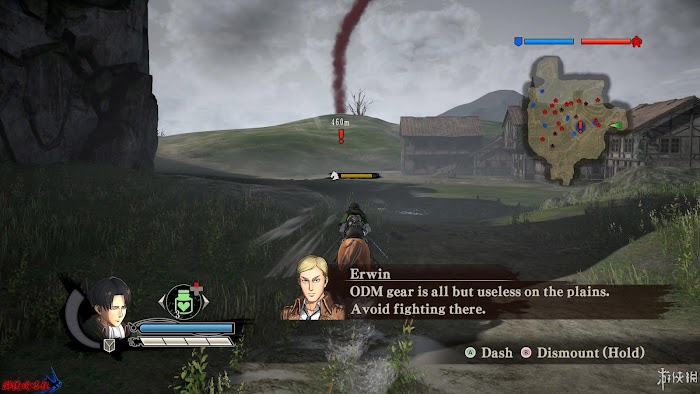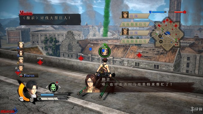 右上角為當前區域小地圖,小地圖顯示的“!”顏色與煙霧顏色對應。不同體型的巨人也通過不同圖示表示出來。還能在地圖上查看到[馬匹]、[加農炮]、[後援小隊]以及各種道具的詳細地點。小地圖上方藍色槽顯示為人類有生力量,紅色則為巨人。通常地圖下方還會出現相關提示。