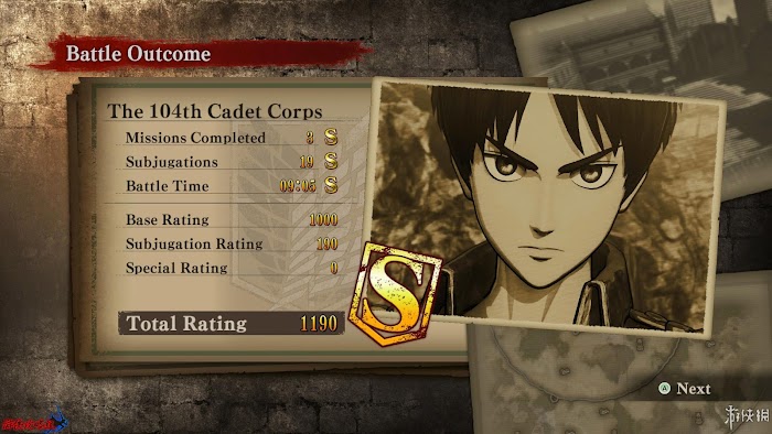 遊戲的過關評價標準有三個:[Mission Complete|任務完成數]、[Subjugations|討伐數]、[Battle Time|過關時間]。任務完成數和討伐數需要獲得[S]評價必須完成除主線之外的全部任務和擊殺全部巨人,過關時間越短評價越高,至於每個關卡的具體數值就需要玩家自行去刷了。下方的[Base Rating|基本得分]、[Subjugation Rating|討伐得分]、[Special Rating|特殊得分]分別與完成任務評價、巨人討伐數、特殊任務有關,三者相加得到[Total Rating|總體評分]。
