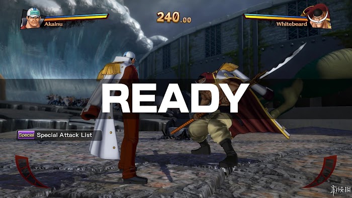①這場戰鬥控制白鬍子攻擊赤犬。白鬍子的長武器依舊有攻擊上的優勢,並且赤犬相對不會這麼防禦,我們只要跑動沖上去撞擊起手,不斷的打出連擊即可讓其沒有還手能力,能量條蓄滿後還可以使用必殺來個帥氣的終結。