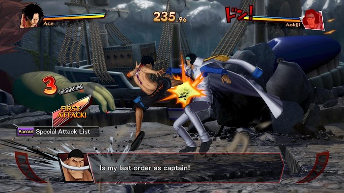 ①在這場戰鬥中敵方有三人,按照赤犬,青雉,黃猿的順序輪流上場。戰鬥並不要求將他們全部打敗,只要撐過60秒即可完成任務。