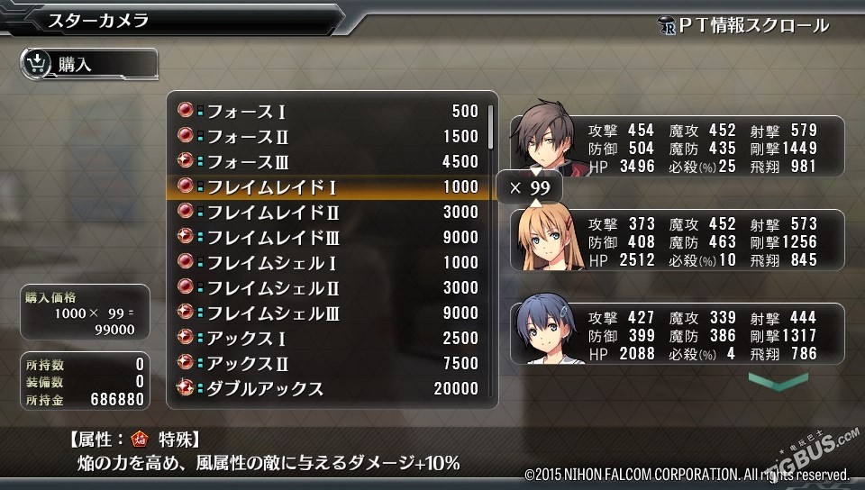 然後去站前廣場的《スターカメラ》商店購買エレメント,種類的話先選擇焰屬性,末尾是レイドⅠ和シェルⅠ的道具,如圖。