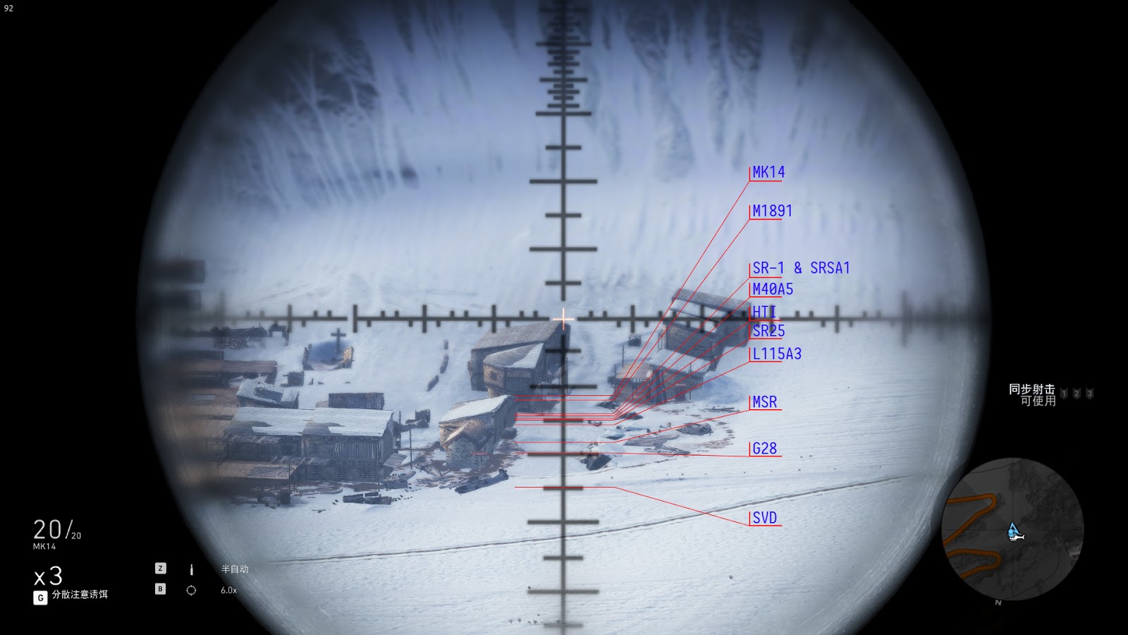閑著沒事給狙擊槍初速排了下名,配置都是儘量長槍管+補償器v2,沒有補償器的都是原廠槍口不帶消音器,測試方法很簡單,用準星橫線對齊圖裡中間屋脊尖角射擊,錄影觀察落點。
