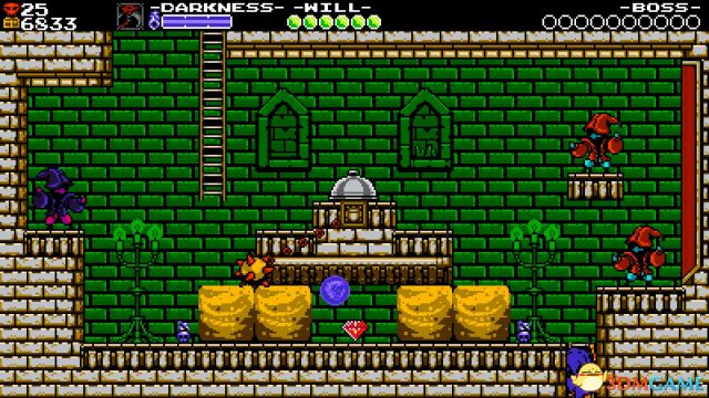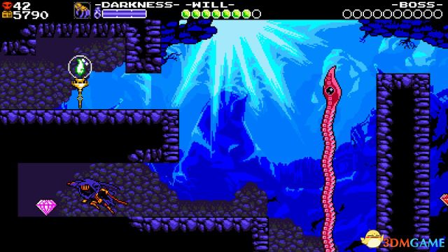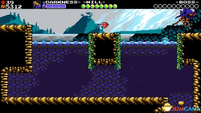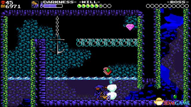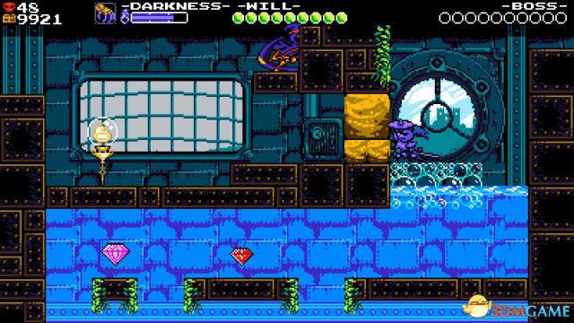 而沿著水底往右側走去,在一個揮舞流星錘的盔甲兵身後落到盔甲兵的下方可以拿到兩顆粉紅寶石以及當中的紅骷髏(5/7)。