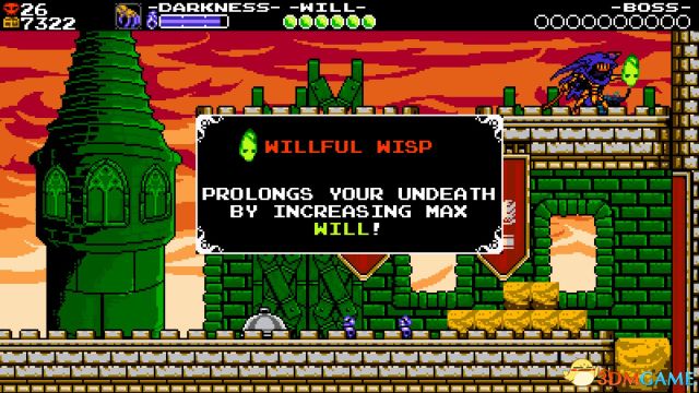 在存檔點左側可以找到一個生命寶箱,擊碎它就可以令到幽靈騎士的血量提升1點(目前生命值可以到達5)。