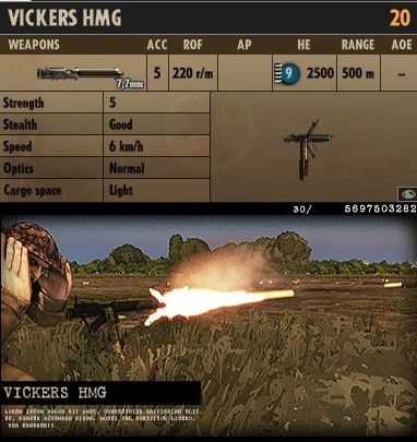 首先是名稱FallschirmJager(空降獵兵),然後右上方的50則這個單位消耗50點。下方的Strength為10就是這個班組有10位士兵。Stealth為Good就是有著不錯的隱蔽能力,Speed為8km/h就是移動速度,Optics為Normal就是光學系統一般(發現敵人的能力一般),Cargo Space為Heavy就是裝載的體積為重,這個指的是當這個步兵單位上載具的時候,只有對方的Transport Space大於等於Heavy這個步兵單位才能上對方載具(終於不是一個班15人坐著吉普車就上了前線)。那麼從上到下是四樣武器——1.步槍-FG42,2.步槍-G43,3.班組支援武器-MG34輕機槍,4.輕型反坦克武器-149mm火箭筒。武器面板從左到右分別是Weapon(武器),Accuracy(精度),Rate of Fire(射速), Armor Piercing(穿甲),High Exlplosive(高爆),Range(射程),AOE(濺射範圍)這樣就有了一個基本的瞭解。下面細化地講一下。