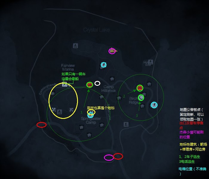 逃生的方式有四種(生存不算逃生):船、車、員警、殺傑森。其中員警每局都可以喊,殺傑森講究天時地利與人和就不在此特殊說明了詳見攻略貼士,二座車只在沒有船的情況下存在,下面上一下每個地圖的車位和船位的點,以及配件有可能存在的位置。