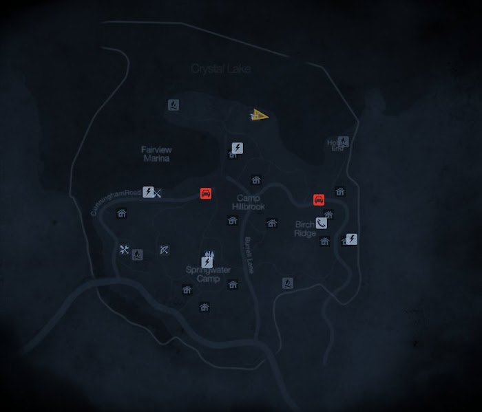 相比較于黎明殺機的地圖多樣來講,十三號星期五的地圖其實比較少一共只有三張,分別為:派克納克(藍色兩層樓房),水晶湖營地(有修理房和湖邊小屋),希金斯花園(有墓地和木質二層樓房)。下面上一下地圖(部分逃生工具位置可能會有變動大同小異):