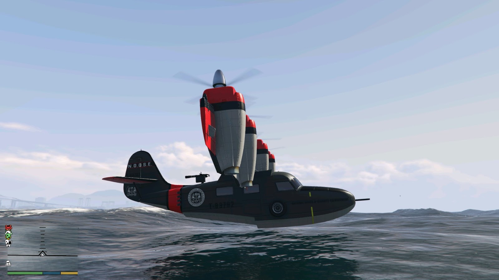 我對圖拉的看法還真的出現了偏差啊,雖然確實如我所說這飛機**不行舔地也不行,但我忽視掉了此飛機可以水上降落,配合垂直升降帶來的海陸空全地形超強便捷移動能力。該飛機和海風最大的區別為該飛機可以多坐三個人(圖拉為五人載具,而海風為雙人載具),整個ceo全部都可以拉上,主駕駛的機槍和後座的機炮還有投彈倉,炸個npc船什麼的都是小意思,而且此載具海面也可以垂直/噴射雙模式起降,真為海上運貨神器啊