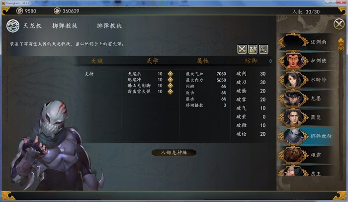 霹靂堂勢力,功體暴擊氣盾,雷火彈傷害可以,不過救霹靂堂的主要價值是霹靂堂那張圖有5個霹靂雷火彈可以撿,打完還再送三個,霹靂幫眾還是賣掉算了