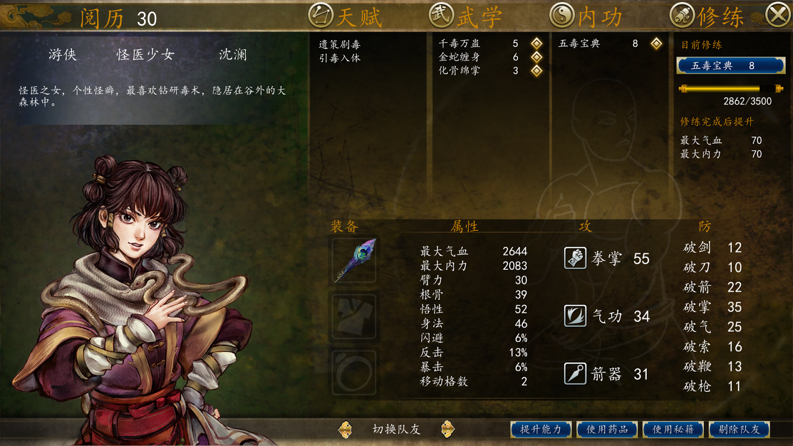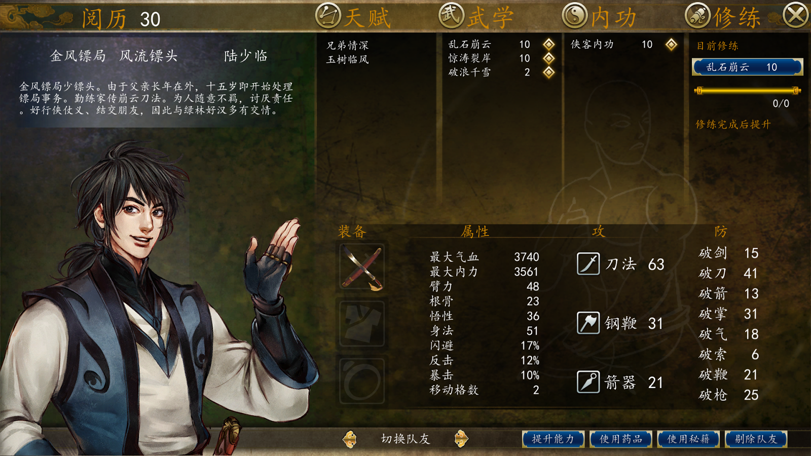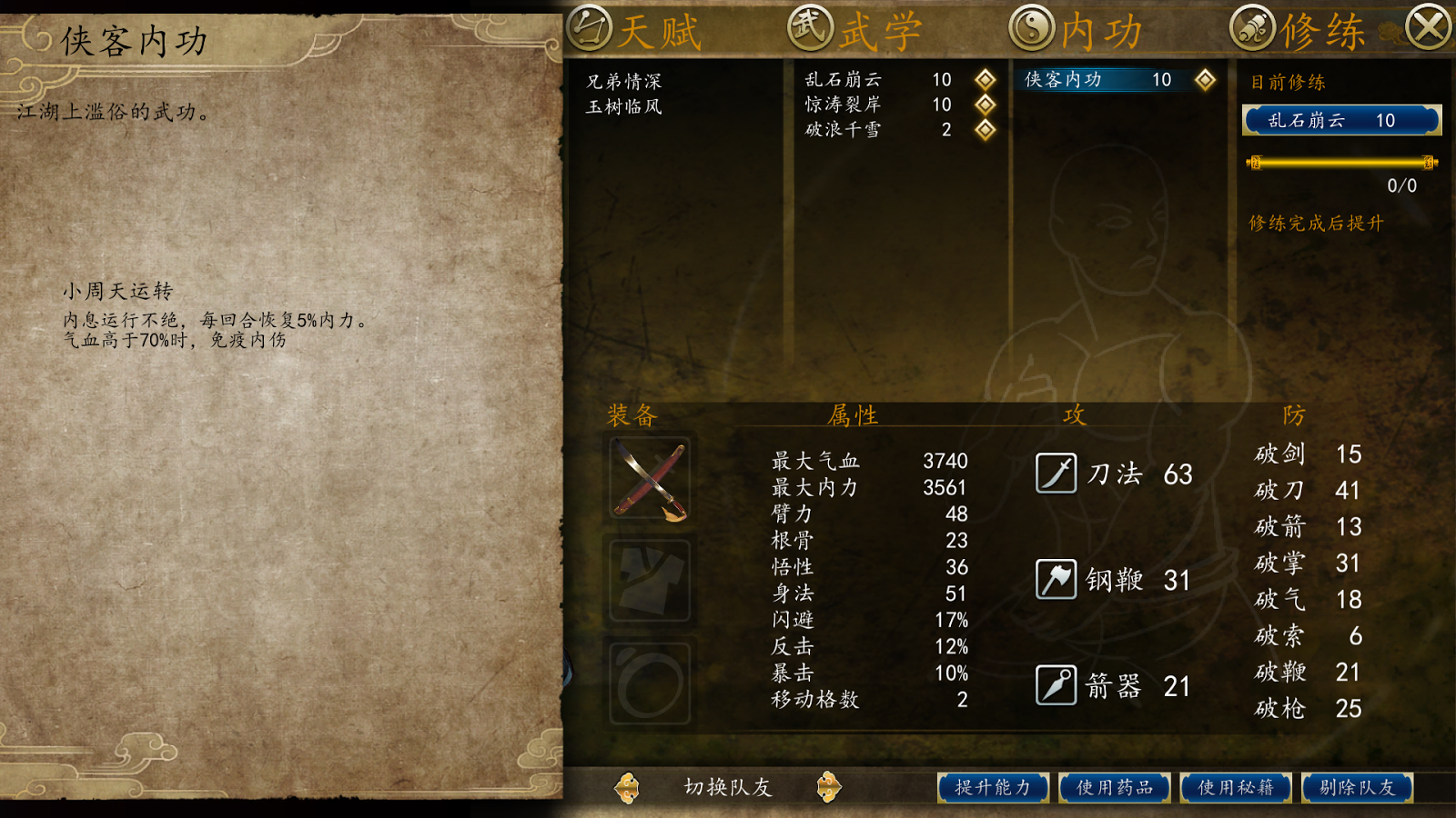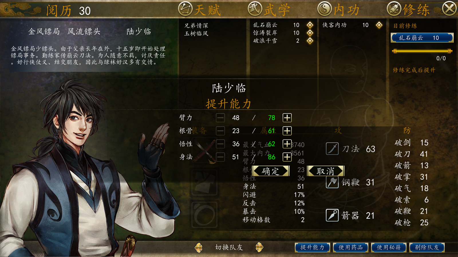 初始刀法挺高的,但是內功,你在逗我? 天賦結合了大師兄和校服,還算符合人物性格。
