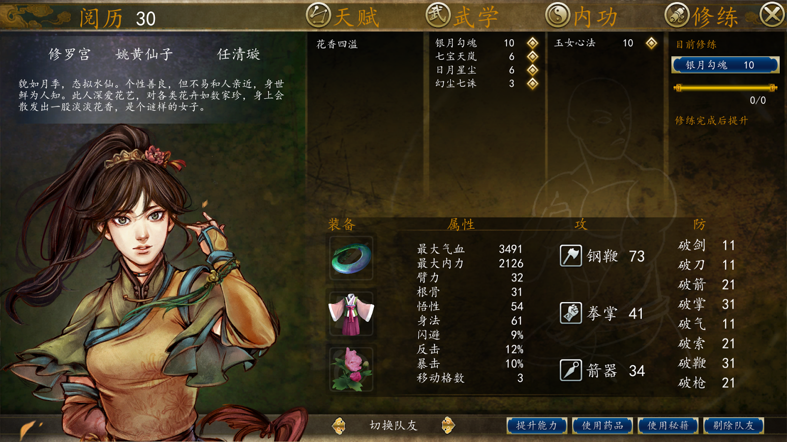 清璿妹子,初始兩個上80的,前三個技能都是鋼鞭,最後一個是暗器。初始的鋼鞭就有73不低了。