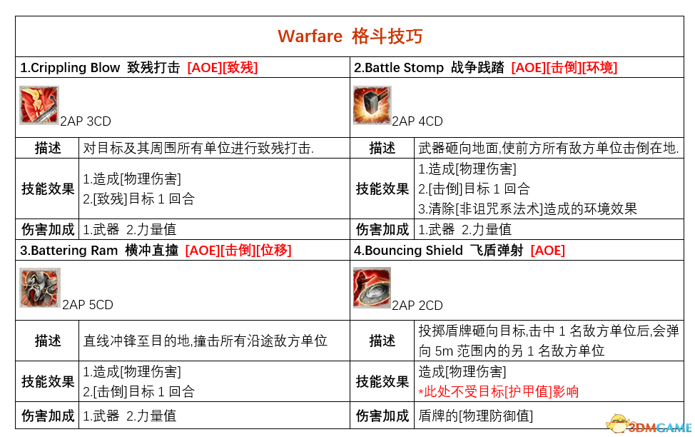 舉例:”該技能>消耗行動點2,冷卻時間4回合”簡寫為”2AP 4CD”