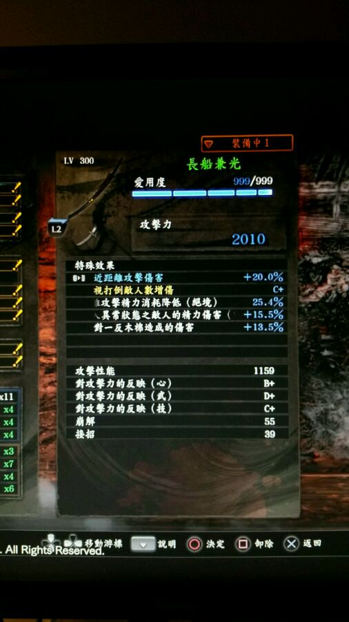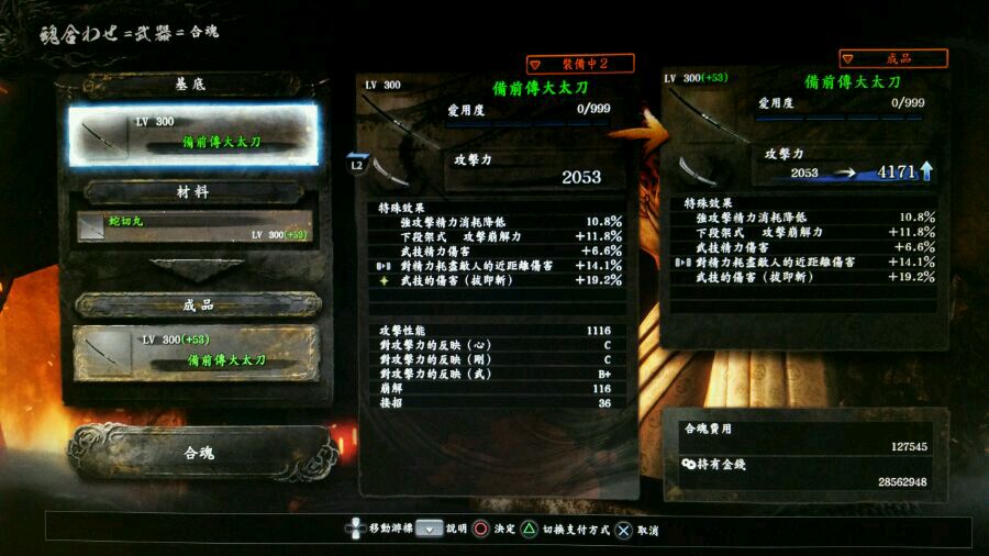 左右兩把大太刀,都是同個等級,但是由於右邊的有反應(剛)C,所以後者面板明顯高。