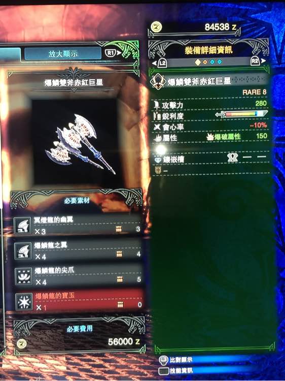 下一位!強斧II!266攻擊,無匠短藍,匠5超長藍,0會心,180需要解放的爆破屬性,3級孔,10防禦。