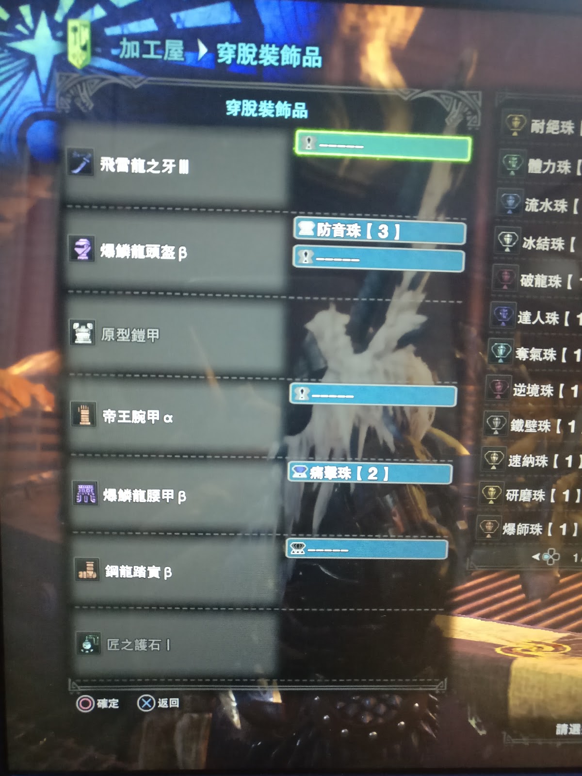 這裡匠裝備匠1的我看了下有效孔量都很少 比如 巨甲蟲鞋子 就一個珠子+匠1 我們配護石的時候就要選擇用護石去填這種辣雞裝備的坑 所以這裡護石可能就要選匠的了 因為我沒有匠的珠子 這裡我們可以看到匠護石和耳塞護石都是九孔護石。算是非常好的護石了 其實只要有額外一顆珠子 還是可以選的 這裡我有一顆放音珠 所以選2個耳塞去配合匠2+匠3護石