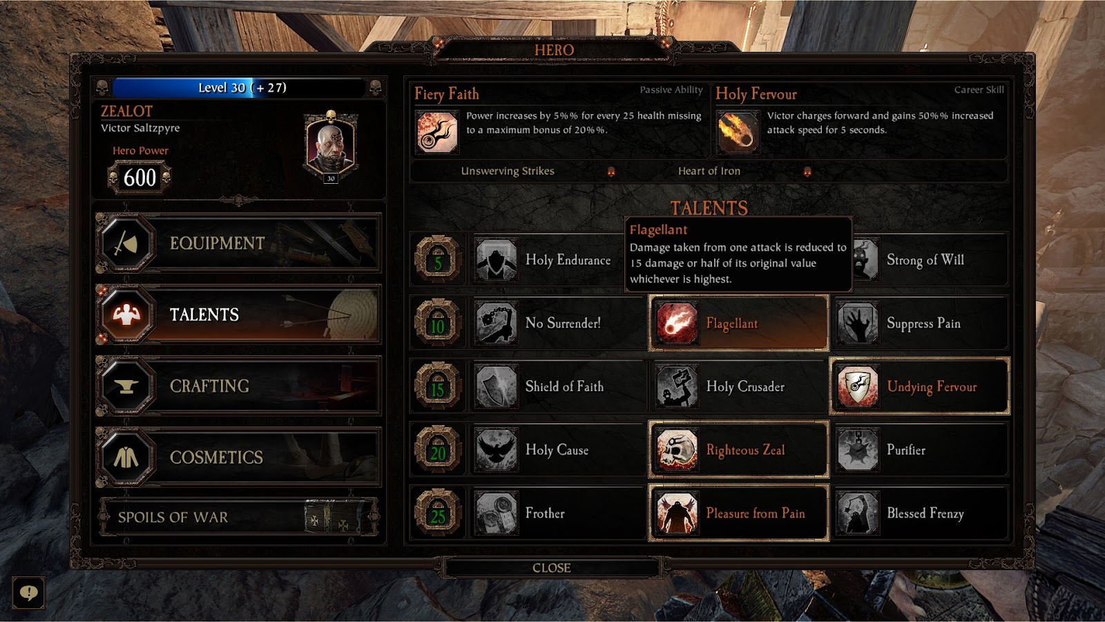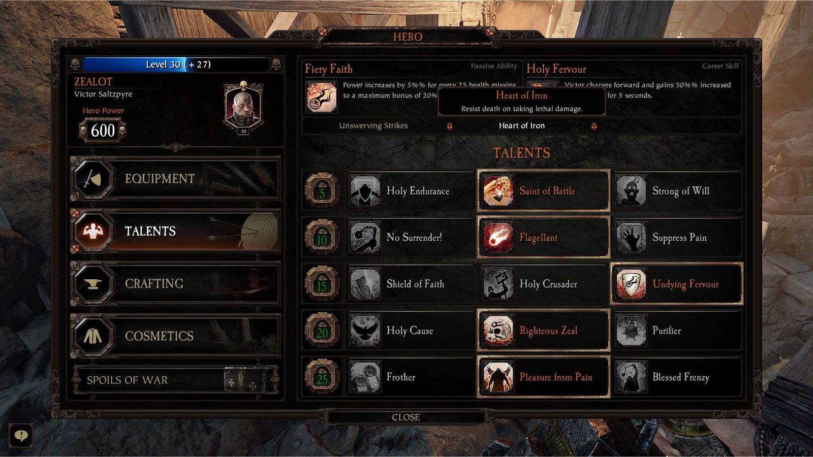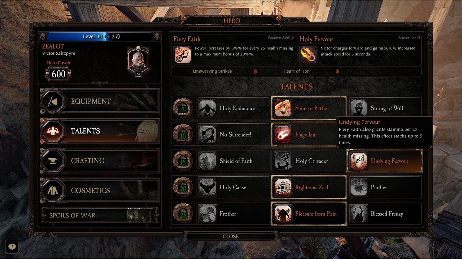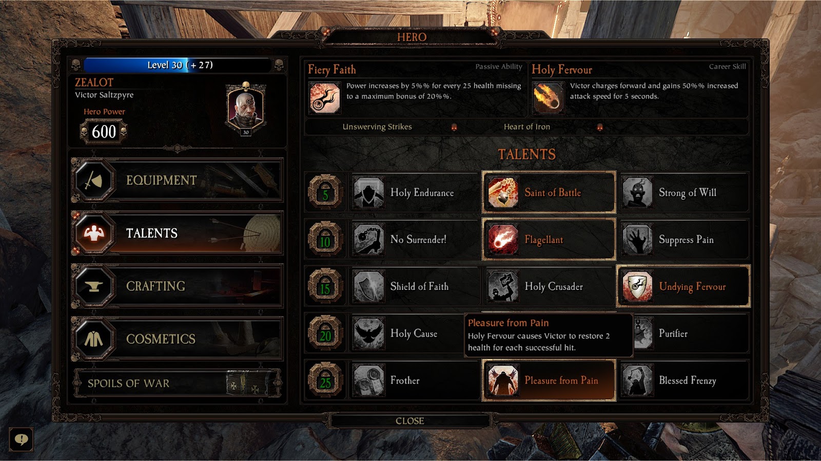 Holy fervour:神聖狂熱:隨著一聲怒吼,維克多向前衝鋒,可以短暫眩暈前方的非屍潮怪,比如混沌戰士,風暴鼠,狂戰士,無視小怪(小怪會被撞開,但是不會倒地),同時增加50%攻速。
