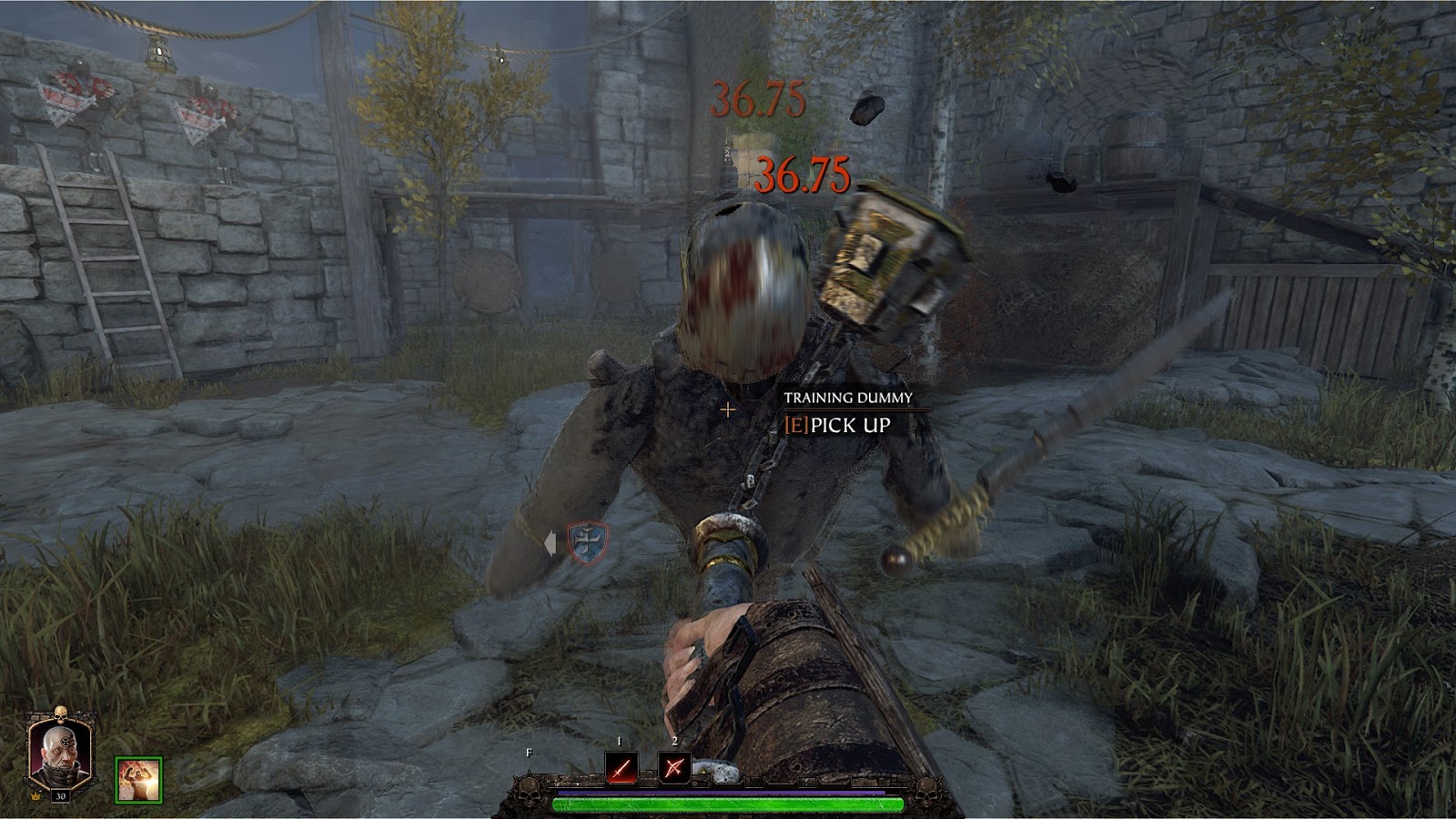 吊炸天,可以說是除了處刑者大劍之外最強的全能型武器,唯一不足的時只有很少的體力,同時揮動速度很快,這個武器頭兩下動作是先向左掄然後右掄,這兩下是大範圍的aoe,隨後會快速地敲兩下頭,注意在清屍潮時用防禦取消後兩下攻擊,不然很容易傷血。如果是打混沌勇士之類的裝甲怪,蓄力+輕擊+劈頭二連,不暴擊可以打出大約35.25的傷害。同時可以給裝甲怪一個小的僵直。同時鏈錘的防禦反擊是大範圍攻擊,很適合清群怪。屬性上選擇暴擊和體力,特效選擇加暴擊攻速。效果如下