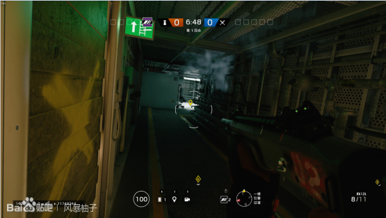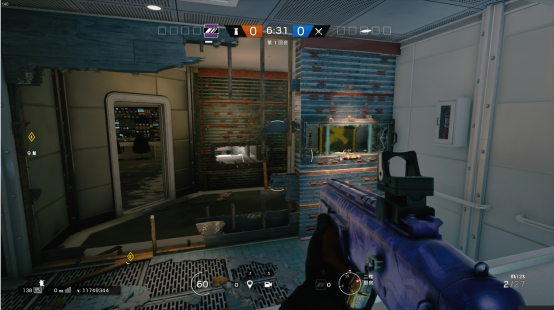 可以看到,地圖室內書櫃和左邊的牆體是無法進行加固而且可以穿透的,但是防守方可以利用這個特點加固書櫃右邊的牆面,然後放置一塊黑鏡,如果看到人,直接穿牆打即可。同樣的道理,黑鏡也可以放在書櫃左邊的牆面上。進攻方的破解方法也很簡單,選人的時候帶上ASH或者索菲亞,看到防守方這樣改造地形以後直接一發爆破榴彈砸在這面牆上,就能在房間外架住地圖室內的敵人。