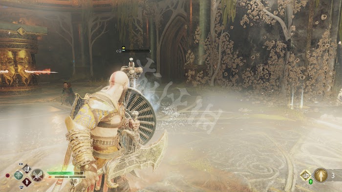接著進入主線流程中的最終boss戰,第一階段開始時,芙蕾雅會不時用藤蔓來鎖住奎托斯和巴德爾,這時候等藤蔓解除對巴德爾進攻即可。