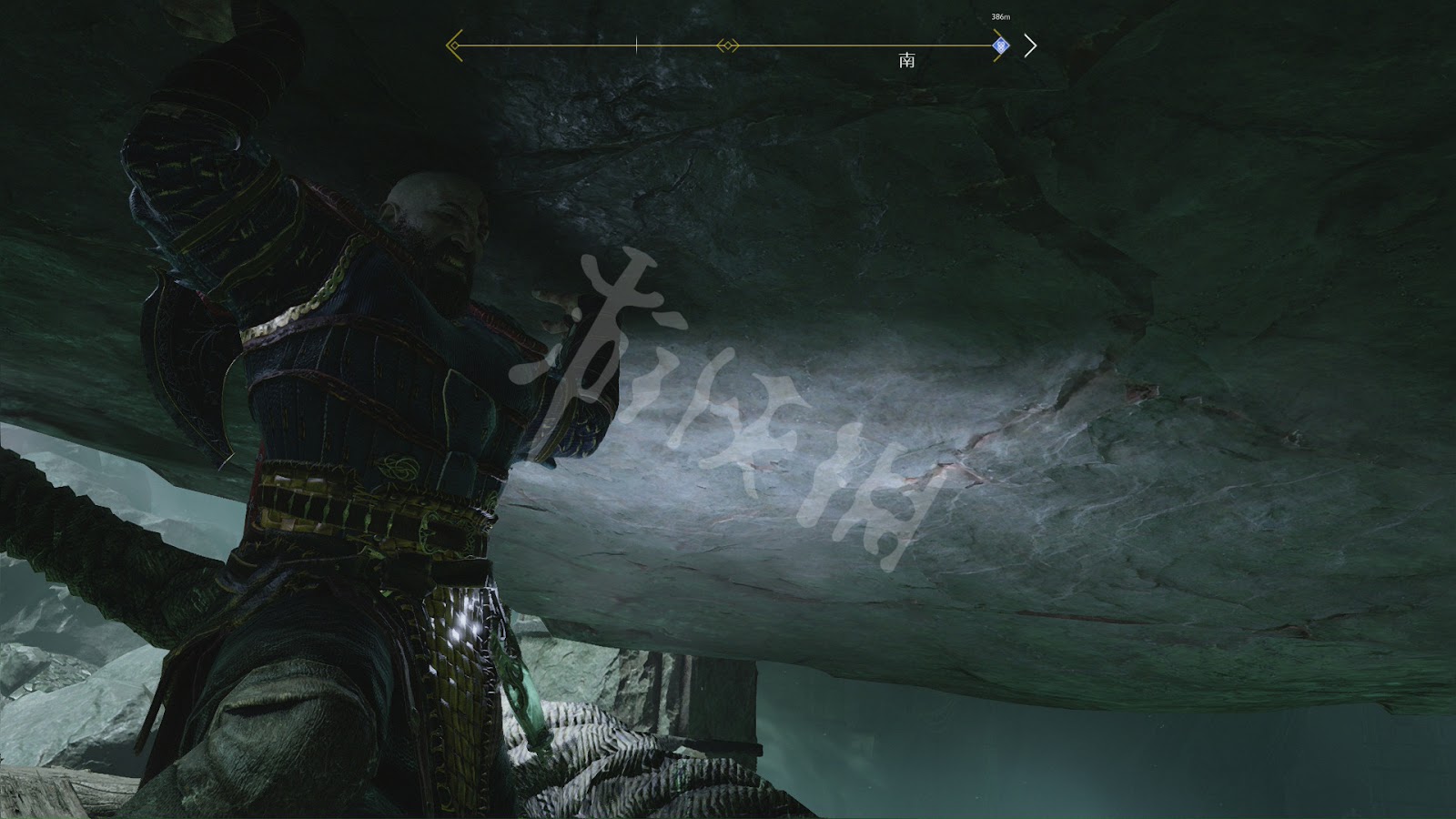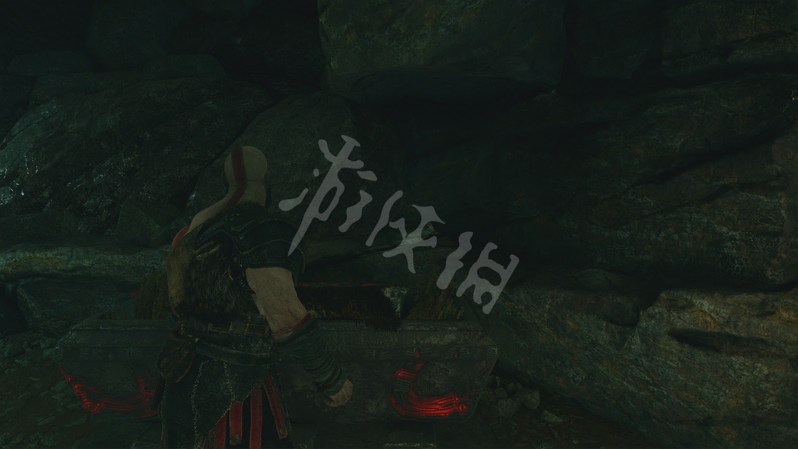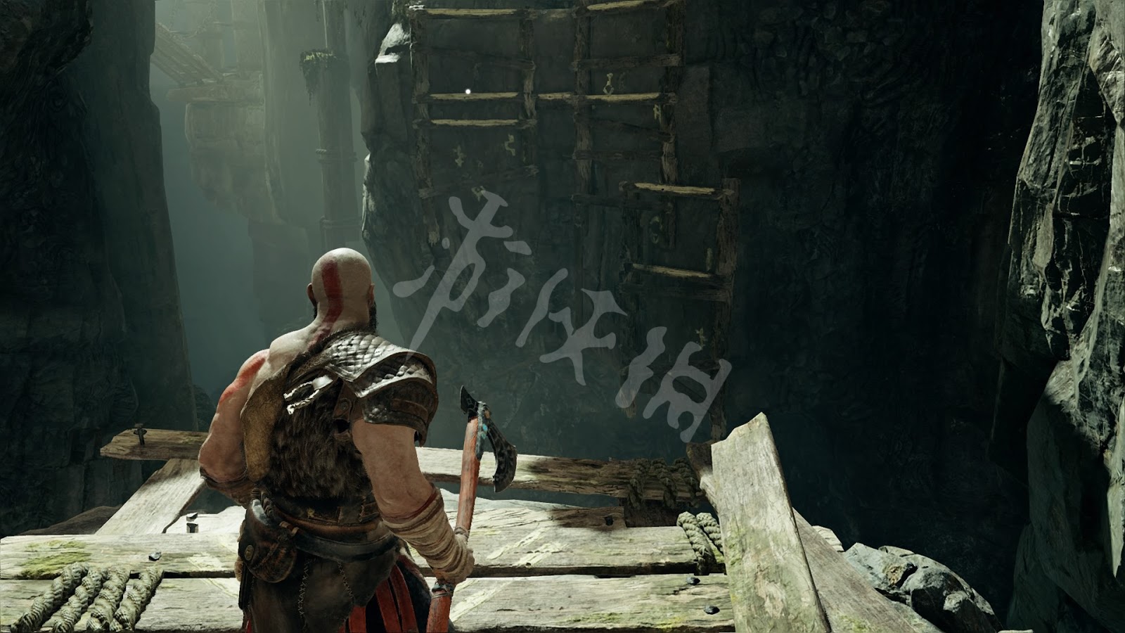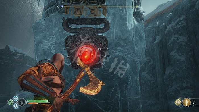 划船到蛇肚的盡頭上岸,並用斧頭投擲纜車的機關,當纜車移過來後凍住。沿著符文牆壁爬上去後跳到纜車上收回斧頭。