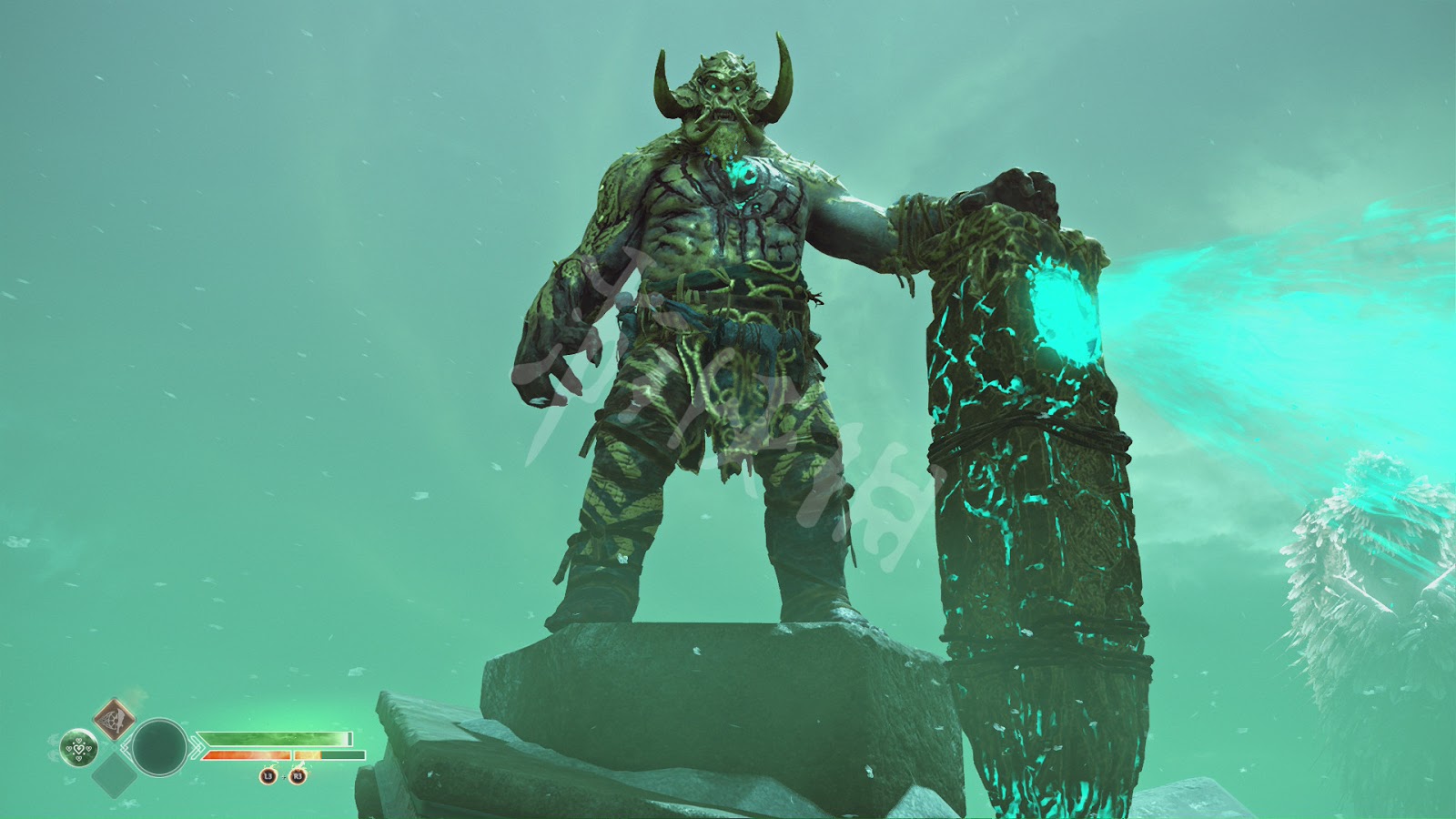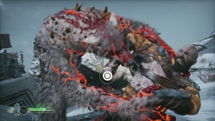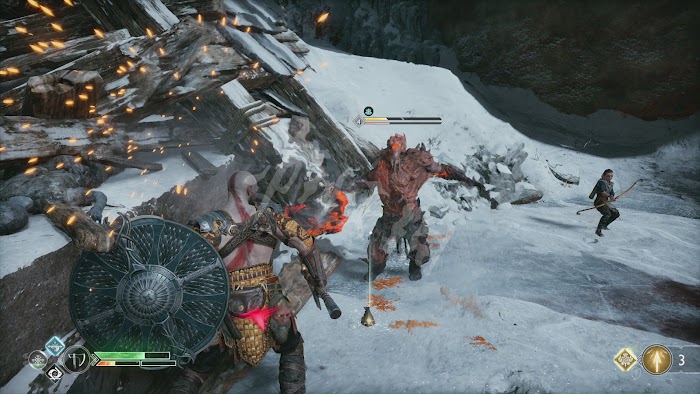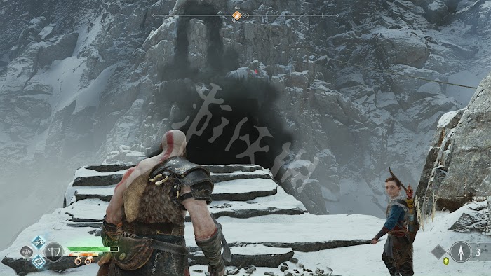 在一定血量時,山怪會進行連續的掄石柱攻擊,這招的移動速度不快,範圍也不遠,提前跑開後不停地甩斧子和命令阿特柔斯射箭輸出就好。懸崖邊有格治療石,血量不夠的話記得跑過去踩。打完後會有傳統的qte終結演示。山怪的血量較厚,但攻擊都非常容易躲避,只要不貪刀,基本不會有什麼危險,當然也可以全程投擲斧頭風箏巨人,不過投擲對巨人造成的傷害不是特別高。