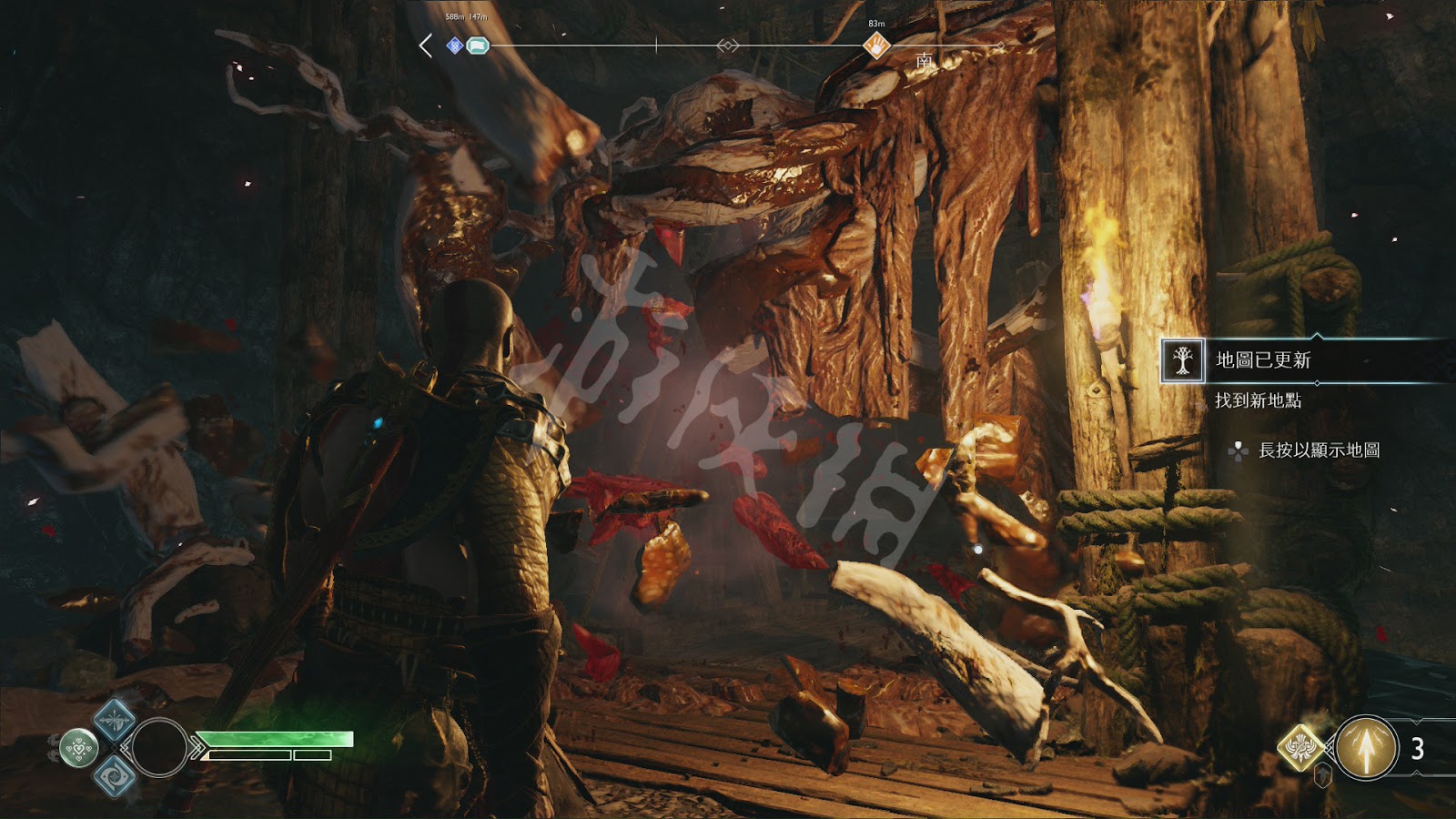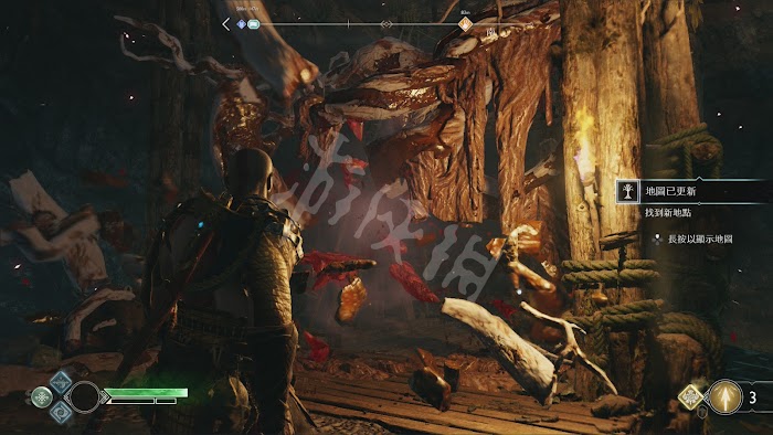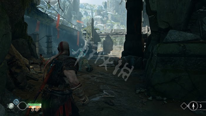 這些疑惑似乎暫時不能解開,爬上身後的臺階,穿過岩壁間的縫隙。來到野林邊境,往前走會出現多個亡靈戰士,利用投擲斧頭的冰凍攻擊等,邊打邊控制解決掉第一批敵人。之後會出現左臂上有火焰的亡靈戰士,他們除了近戰外還會進行遠端的火焰攻擊。出現教程提示,當敵人在視野外使用近戰攻擊時,奎托斯周圍的威脅方向指標會顯示紅色,當時用遠端攻擊時,指標會顯示紫紅色。反正當威脅指標顯示顏色時,建議馬上進行躲避或者防禦。另外,這裡會解鎖快速轉身,按↓方向鍵即可快速轉身調整視角。