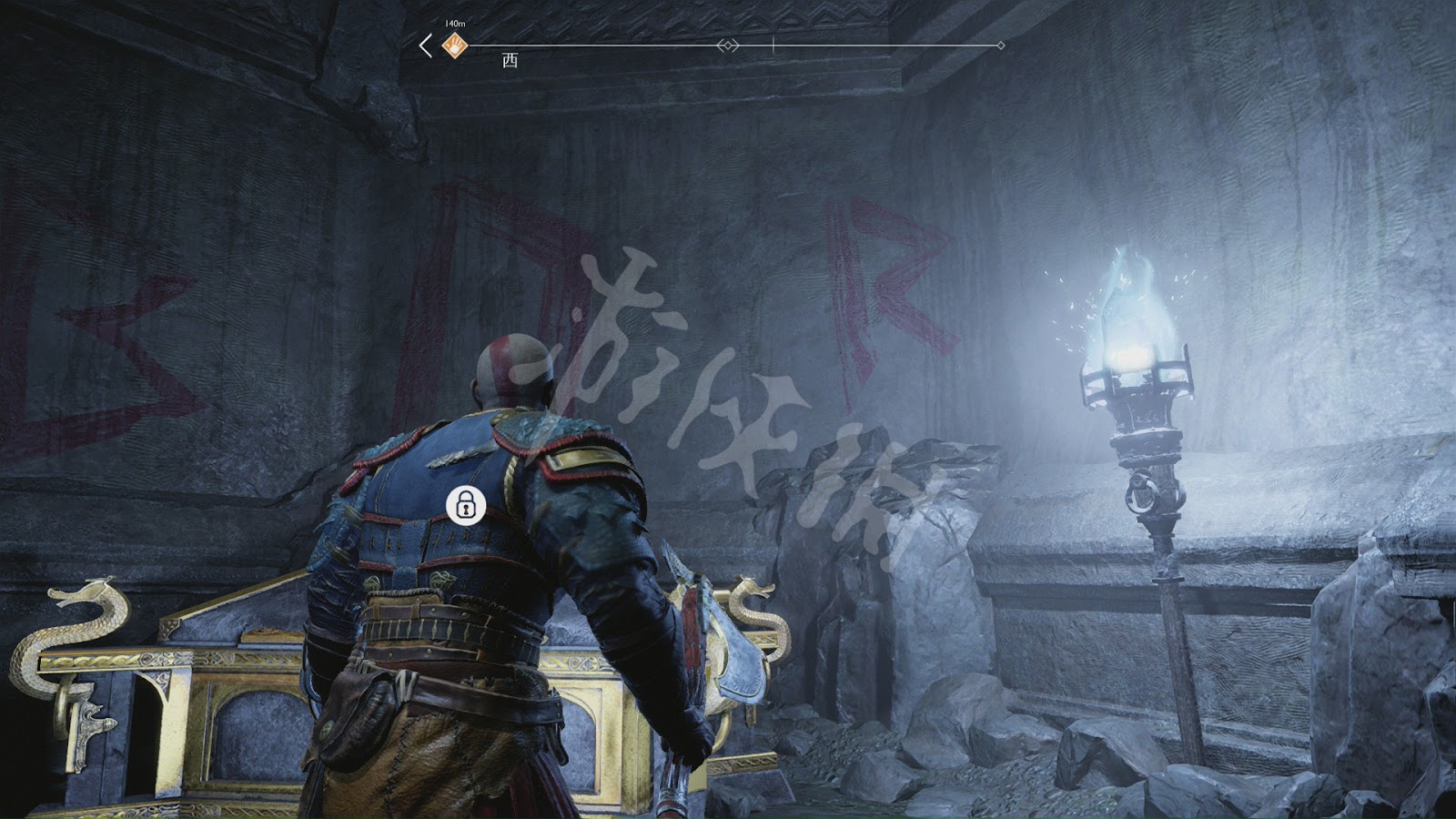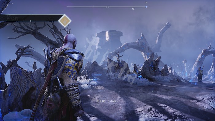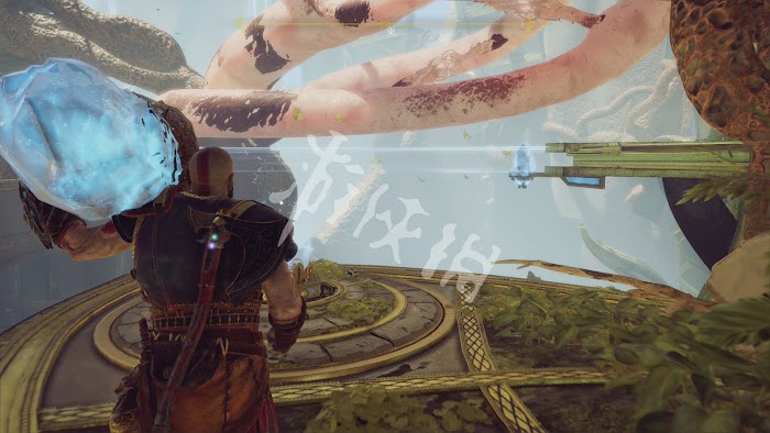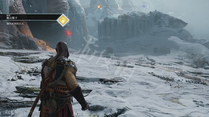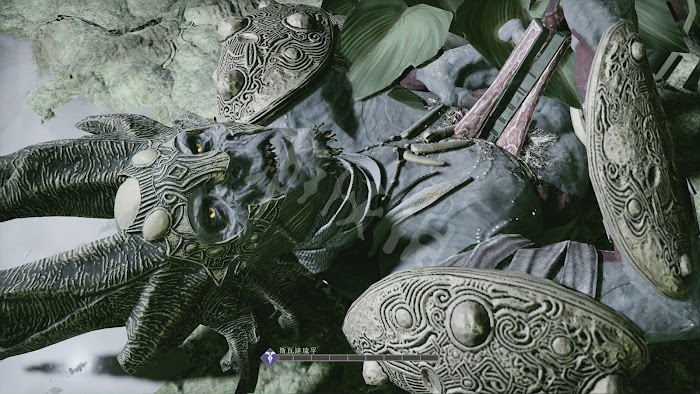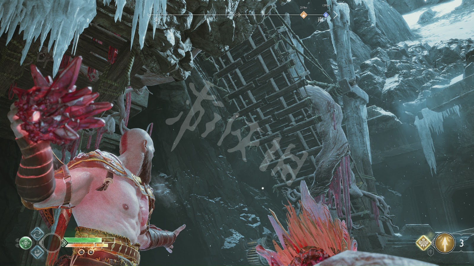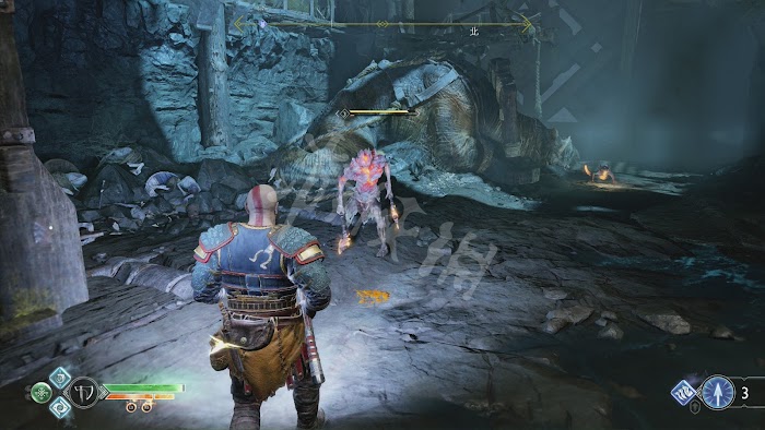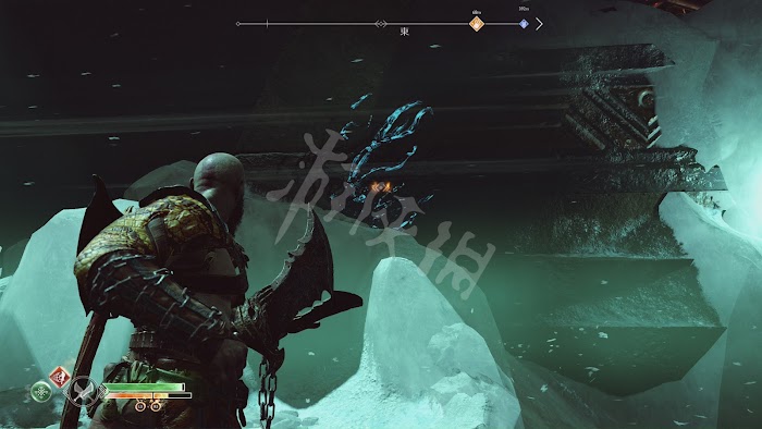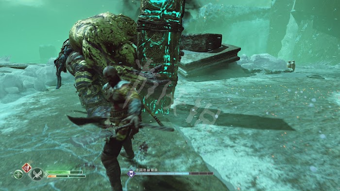 這一路有不少怪物阻擊,不過基本都沒什麼難度。唯一要注意的是[冰霜遠古屍鬼]。和之前碰到的遠古屍鬼一樣,普通攻擊對其無效。需要等它噴射冰凍光線時,向它身體中央的核心投擲斧子,打出發光石頭。然後將石頭砸向屍鬼造成硬直再輸出。這裡推薦可以跑到後方的2根石柱處,再次利用秦王繞柱的方法和它周旋。