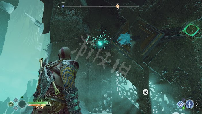 第3個需要放下吊橋,靠近後才能扔斧頭砸到。解鎖3個符文後打開寶箱獲得能夠增加生命值上限的[伊登的蘋果]。