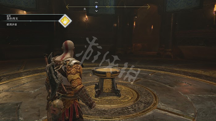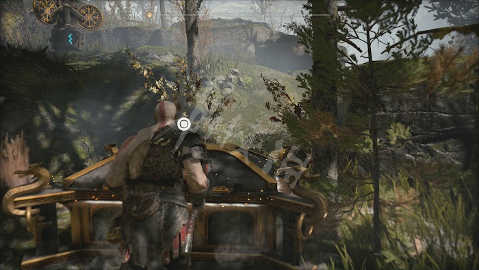 這裡有2條路,先往有木柵欄的一邊走,破壞柵欄,裡面有遊戲中的第一個符文寶箱。符文寶箱和普通的寶箱不同不能直接打開,需要碰觸隱藏在四周的3個符文後才能解鎖。這是第一個符文寶箱,所以符文的位置非常明顯,前2個就在寶箱的兩邊,最後一個在臺階的邊上,用斧頭瞄準射擊打掉就可以。打開符文寶箱獲得[伊登的蘋果],每集齊3個[伊登的蘋果],就可以提升奎托斯的最大生命值。