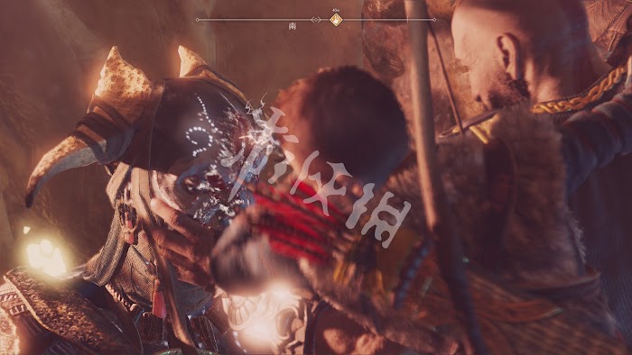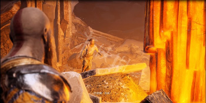 跟著鑿子爬到巨人頭上會遭到巴德爾的猛烈反擊,進入qte階段這裡需要用L1防禦用左搖杆左右移動來躲避巴德爾的重拳。之後按提示按鍵命令阿特柔斯射箭。
