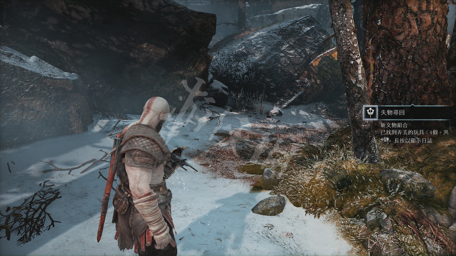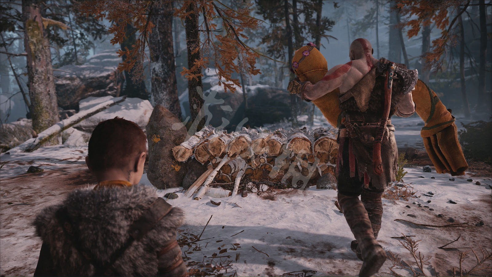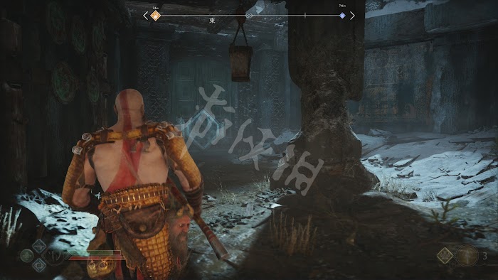 火化了遺體後,為了寄託哀思,奎托斯帶著兒子去獵鹿。出發前在屋外的閃光點可以拾取到[文物]。