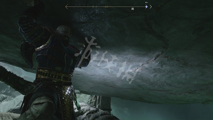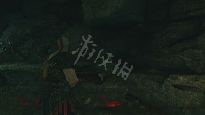 在這裡抬頭往上看,在如圖位置有只發光的烏鴉,投擲斧頭砸中會解鎖新的[功業]奧丁之眼,遊戲中一共有51只這樣的烏鴉需要收集。在北歐傳中奧丁的肩膀有2只烏鴉,分別是代表“思維”的福金及代表“記憶”的霧尼作為他的眼線。在牆邊還有塊符文是新的盧恩符文讀物。