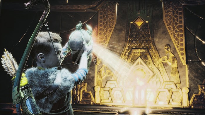 上升中,船會被旁邊的石板卡住,離開船走到岸上,拉動岸上的機關,強行折斷石板。接著進入升降梯內,投擲斧頭轉動升降梯機關,當升降梯到達頂端後凍住機關上的符文盤,離開升降梯從上方的石板跳回船上,並和阿特柔斯將這塊石板搬開