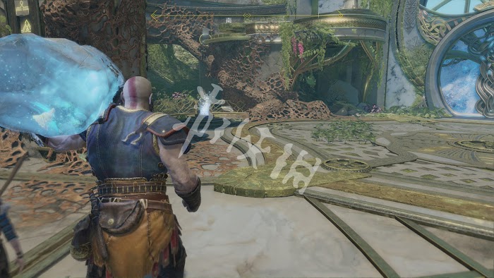 繼續朝著山前進完成後用斧頭,打落前方吊橋上的符文。可以返回之前的廢墟,取得幾個之前拿不到的寶箱。