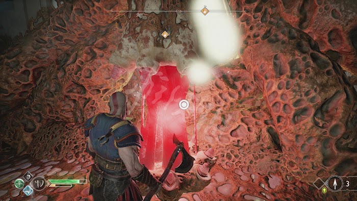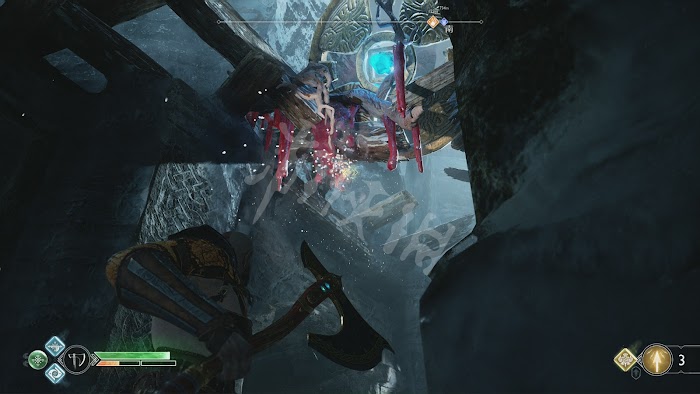 跳到對面,會出現巨型亡靈戰士,用遠端攻擊耗死。這裡會有扇釘刺木門擋住,先收回斧頭,然後迅速甩到右邊的機關上並將其卡住。再一次收回,此時帶刺的天花板會不斷下降,玩家要在這段時間內儘快用斧頭將釘刺木門打開。