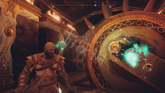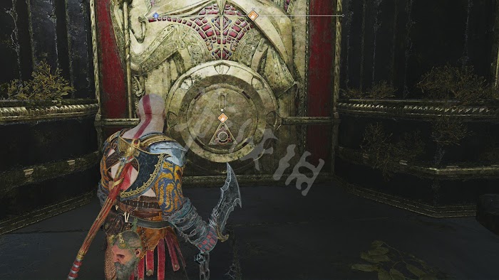 撿完後返回原處,這裡的鐵門需要啟動機關才能打開,按提示拉動機關打開前面的第一道鐵門。但這時候奎托斯如果離開,鐵門會再次降下。所以需要在拉住機關的同時,拋出斧頭定住鐵門上的發光符文盤。