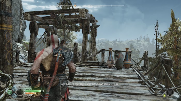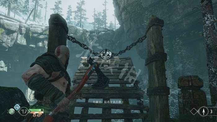 走到吊橋前,吊橋對面的木板突然坍塌,這裡根據提示用→鍵拿起斧子,接著長按L2瞄準,最後按R1或者R2扔出斧子,砸爛木板。遊戲無論斧子扔到哪裡都可以通過按△鍵收回。