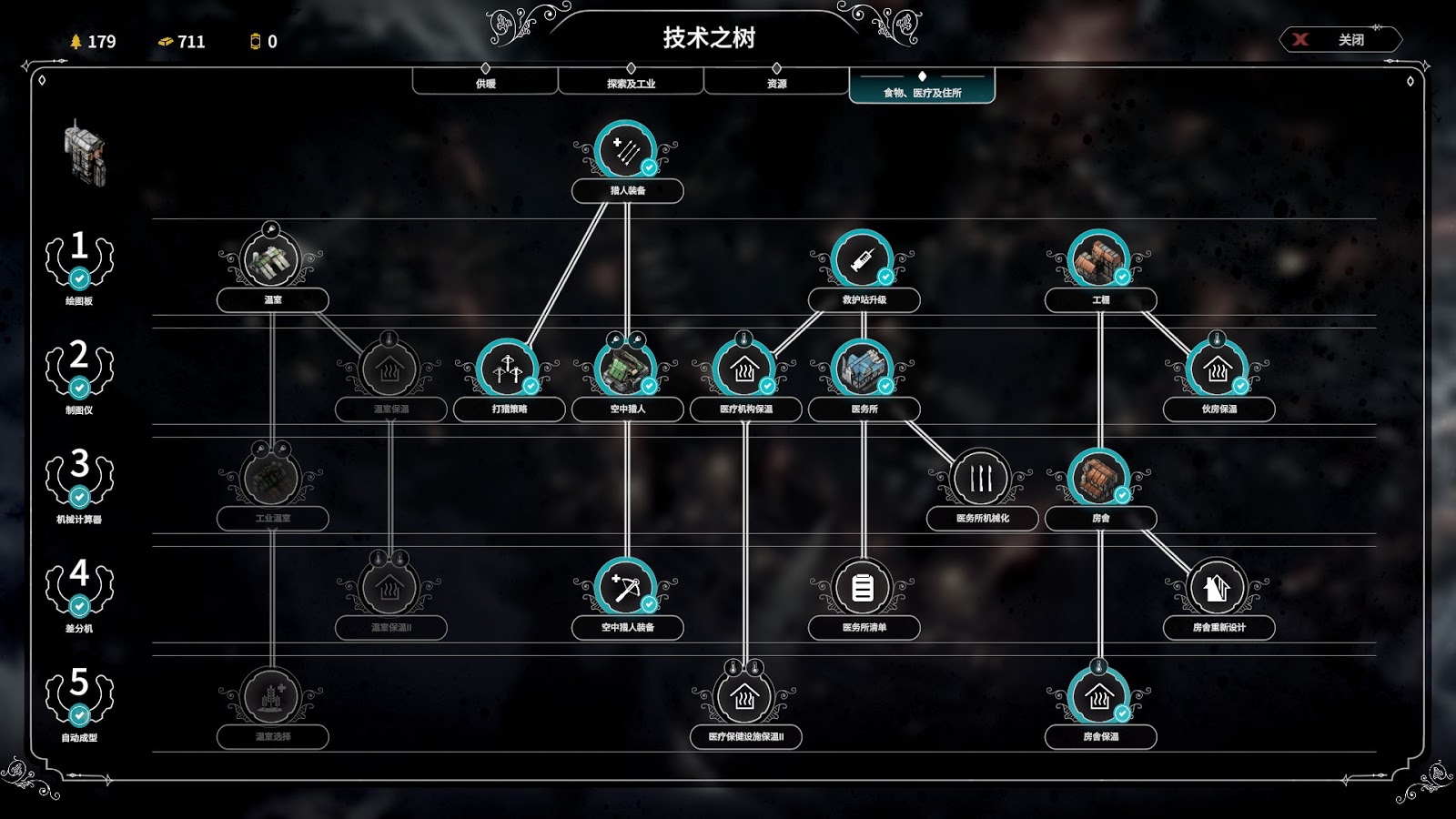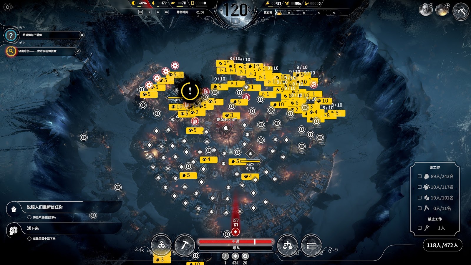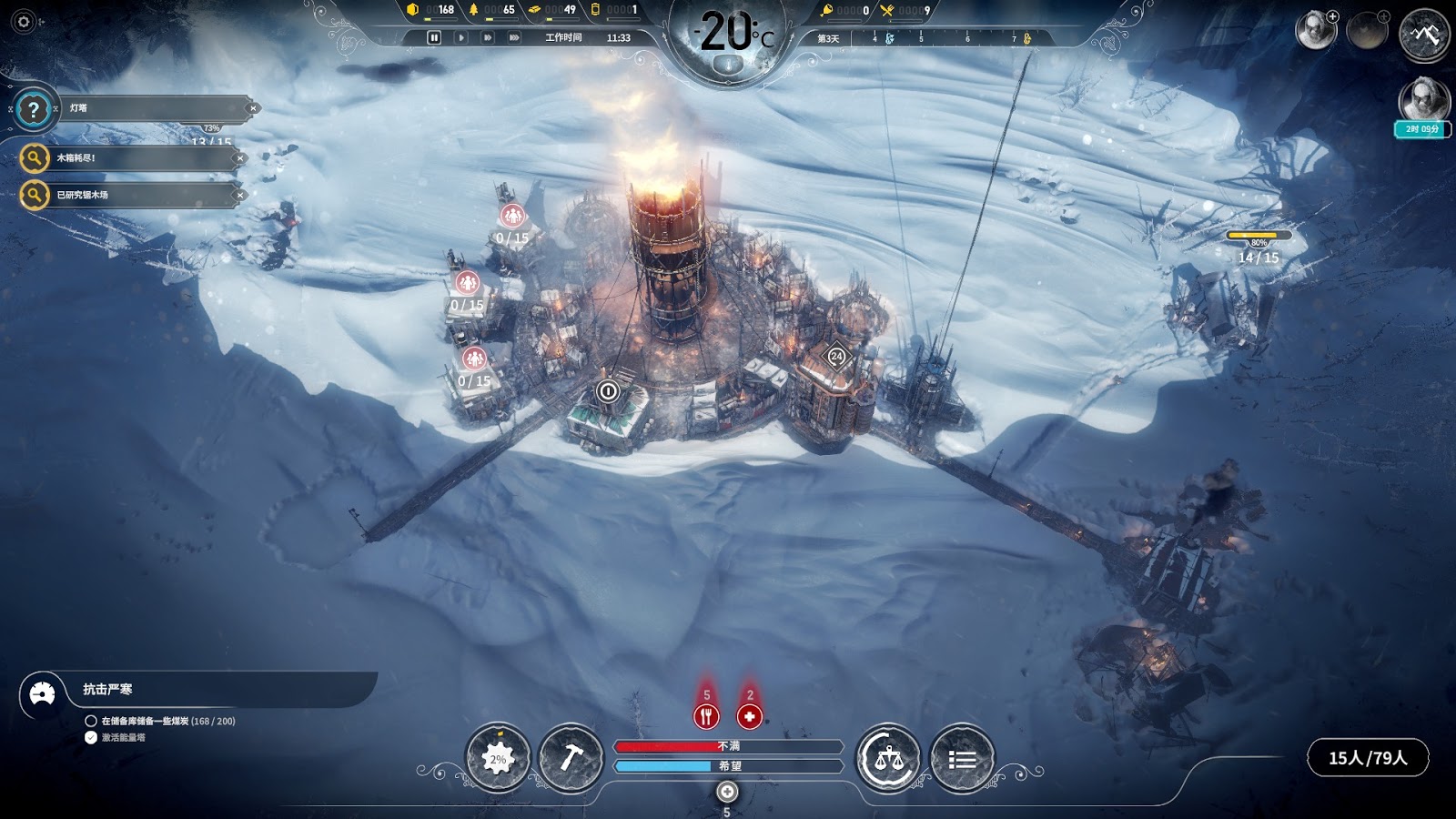 這是我到第五天的時候 寒流下 人群肚子餓,又生病,可以看到我的不滿直線上升,不過問題不大!沒點緊張感 怎麼叫困難模式。第五天我已經補出了3個科技樓,3個醫院來控制我的居民,科技樓裡面的15個工程師是不能動的。我們必須要科技。老套路 白天挖礦的 晚上打獵。 值得一說的是 在補科技樓之前 木材是肯定不夠了的。 我在圖下補了兩個木材廠。這兩個木材廠可以一直用到出鑽機木材廠了。總體科技就是 氣球出了,出木材廠,木材廠出了出溫度,之後出鋼材 煤礦 就按普通的來打就行了。總體一句話,困難的就是人滿就要造東西 補要空缺,一定是多多益善