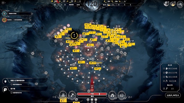 下圖入夜 2點多吧 第二個政策開啟 應急加班。收回野外工人,直接爆3個加班,科技奔氣球出探索 ,為了在寒流來的當天我們的第一批移民到手。(不要在乎這個不滿,玩探索機器人流 就是跟不滿做鬥爭)