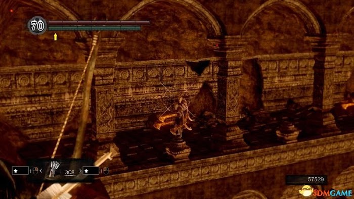 清空大廳內的敵人左邊大門出來懸崖邊的石階上撿取英雄的靈魂X1,回到大廳內用弓箭射落壁爐上面的屍體撿取【魔法】黑暗霧。