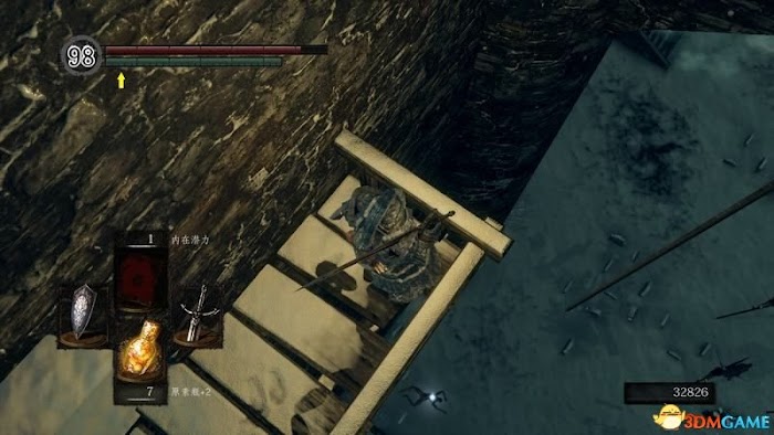 法師旁邊的小房子裡左邊還埋伏一隻,擊殺後撿取驍悍勇者的靈魂X1。小房子左邊往下的長石階不用管,右側石欄缺口落到下面木板上撿取驍悍勇者的靈魂X1