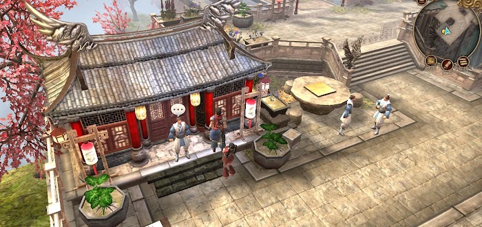 與旁邊弟子對話,上樓梯與兩個弟子對話,【先將宓玥好感+到100】之後前往大廳。