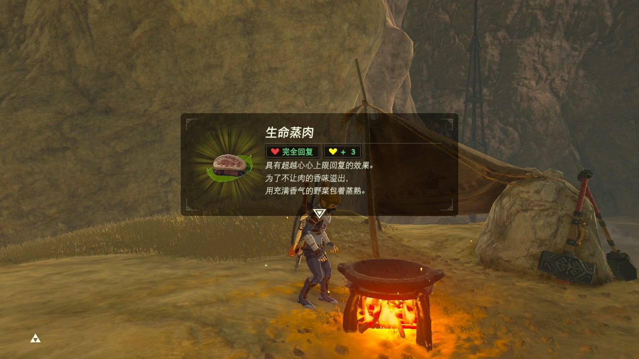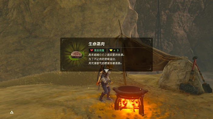 在《塞爾達傳說》中最基礎的做料理方式是“烤”,任何的食材丟到火上都會製作成“烤”製品,這就像速食麵一般簡單快捷,在遊戲中只需要拿出木柴並放上打火石用武器擊打一下即可生火,隨後直接把食材丟至火堆旁邊即可,不過“燒烤”卻不能夠讓食材發揮其本身真正的效果。