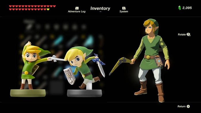 Amiibo在遊戲中每天都能夠刷一次,每次出的道具基本是隨機的,上面所說的服裝體頭/上裝/下裝均是在日常隨機的箱子中開出,所以想要獲取對應的套裝還需要有一定的運氣。另外還有個獨特的Amiibo——狼林克,能夠刷出一隻3血的狼(當時開局一人一隻狗的梗就是這麼來的),想要20心的狼還需要在WiiU的《黃昏公主》中刷一下對應的Amiibo方可解鎖。
