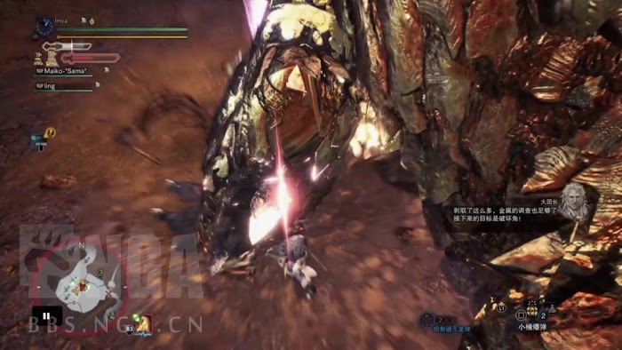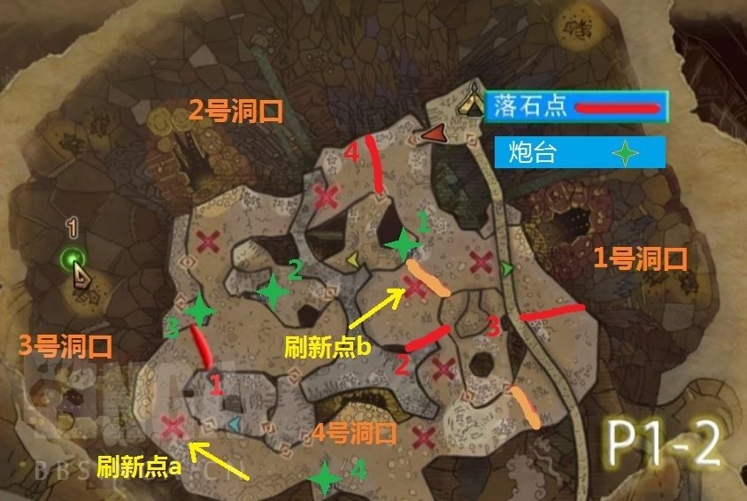接著,她會鑽進2號洞口然後從1號洞口出來(與刷新點a的順序剛好相反)。這時候雖然少砸一個3號落石,但是1號炮臺可以發揮非常出色的功效。5發正中王渣渣的腦門的話,可以打出一個小硬直。這時候再裝填一發炮彈,注意!只裝一發(兩發時間就不夠了)便打出去,Lv4大角黃金必掉。(lv5以上前面5發就轟掉了)接下來的大硬直時間夠單人裝4發炮彈,沒人幫的時候不宜貪多。