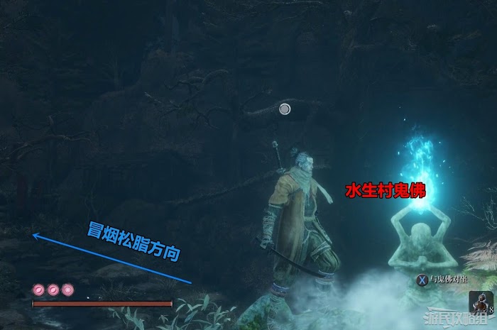 從【葦名之底 水生村】鬼佛處穿過河流到村莊右側的房子,然後從旁邊一直下山到後面的房子,通過梯子爬到房頂可以拾取到金剛屑和【冒煙松脂】。