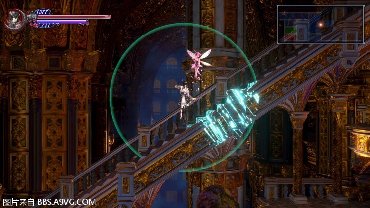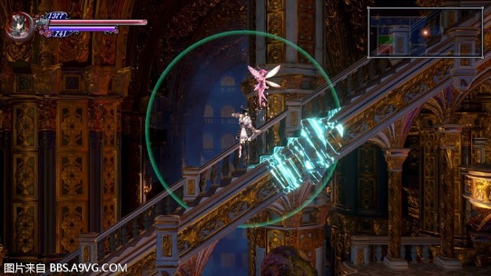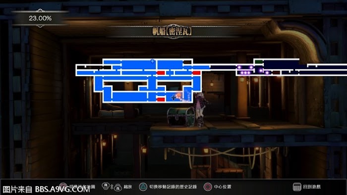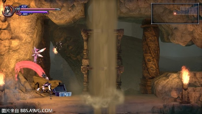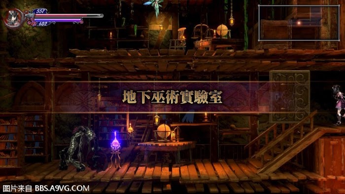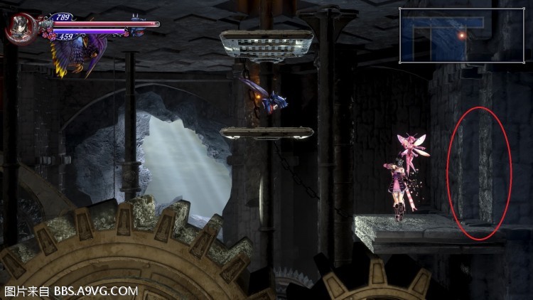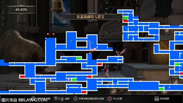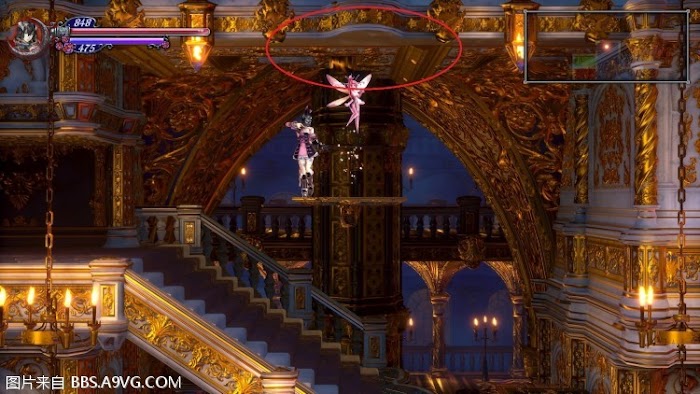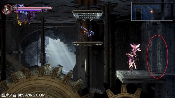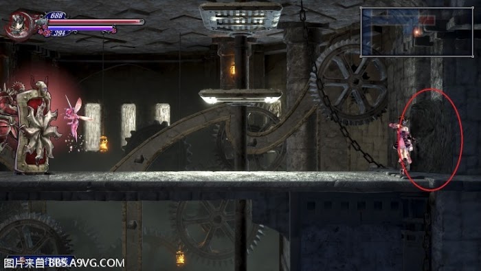 | 記錄點前原先無法上去的地方用反轉上去,鐘裡有MP MAX UP左側上方寶箱木工的鑰匙,開啟機關開門後有HP MAX UP,右側有碎片:銀騎士再開門就回終焉之間了 |