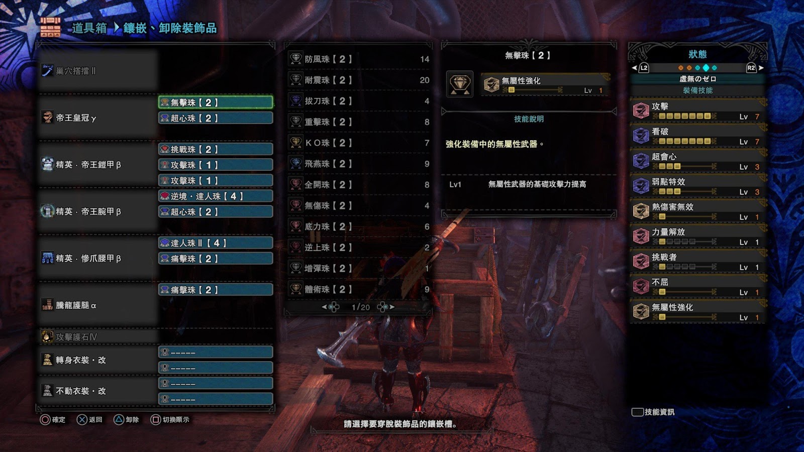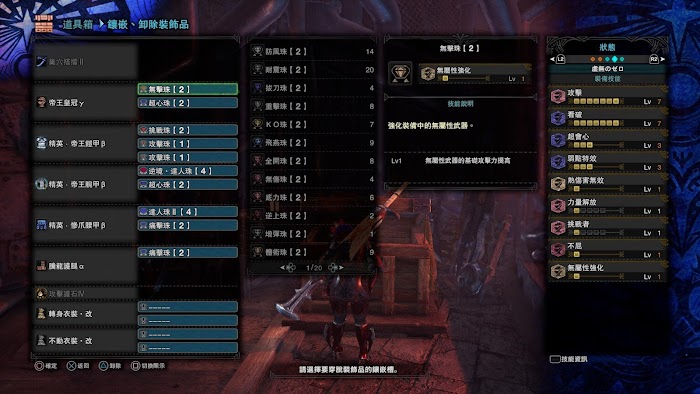而配裝我會默認把地學以及不屈放進去。因為這個階段主要是打聚魔之地。(聚魔可以無限貓,地學可以撿更多聚魔特產)。並且默認你有匠/攻擊/看破搭配逆境的4級珠其中一顆。而且我不會配體三進去(你可以自行拆掉攻擊上體三)因為M位裝備配合不屈2我認為在防禦面已經很足夠了。