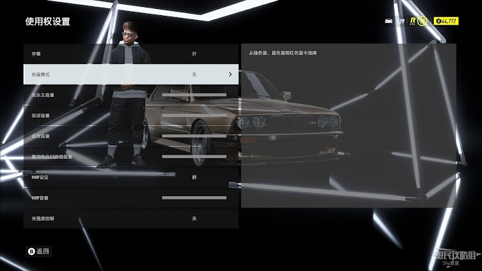 音量:根據喜好自行調整,建議把音樂關掉,然後後臺打開《速度與激情》系列的BGM,這樣開車更帶感,個人覺得本作的BGM不太好聽。
