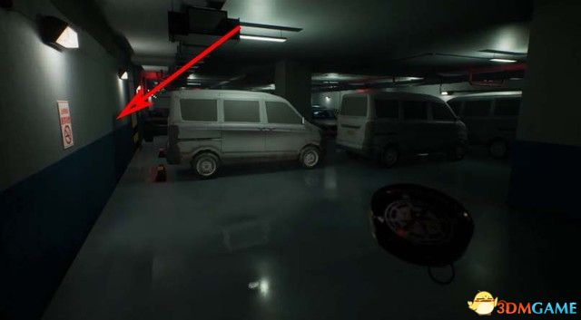 停車場裡,我們需要拉三個閘門才行,首先,沿著箭頭所指的牆壁(就是左邊的牆)一直走,